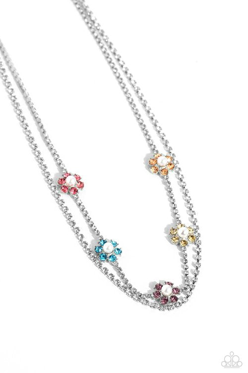 Featuring silver square fittings, white rhinestones cascade into two layers below the collar adding glitzy movement to the sparkling centerpiece. Infused along the uppermost chain, a glitzy collection of pearl-dotted flowers with rose, blue, amethyst, yellow, and peachy rhinestone petals creates a splash of whimsical color. Features an adjustable clasp closure.