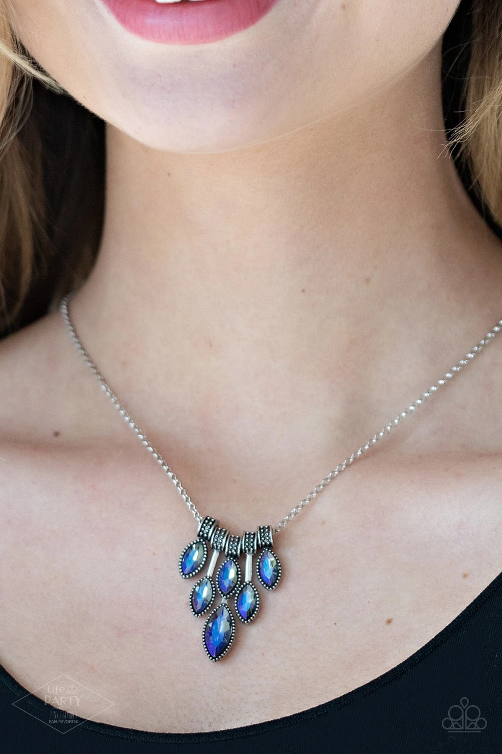Featuring elegant marquise-cuts, sparkling iridescent gems cascade from a shimmery silver chain. Brushed in an antiqued shimmer, textured silver attaches to the dazzling gems, allowing the regal frames to delicately trickle just below the collar. Features an adjustable clasp closure.